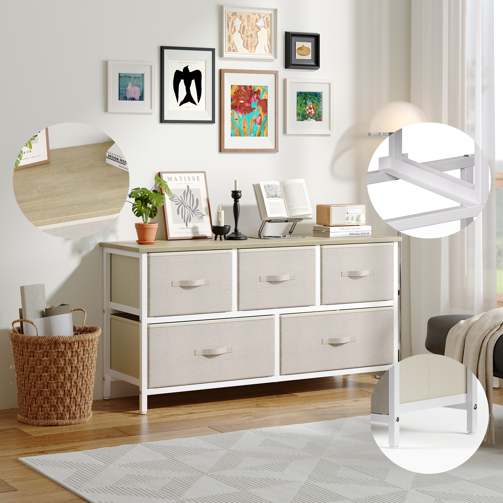 QFTIME 5 Drawer Dresser TV Stand, Sturdy Metal Frame, Massive Storage Fabric Drawers, Chest of Drawers for Bedroom, Living Room